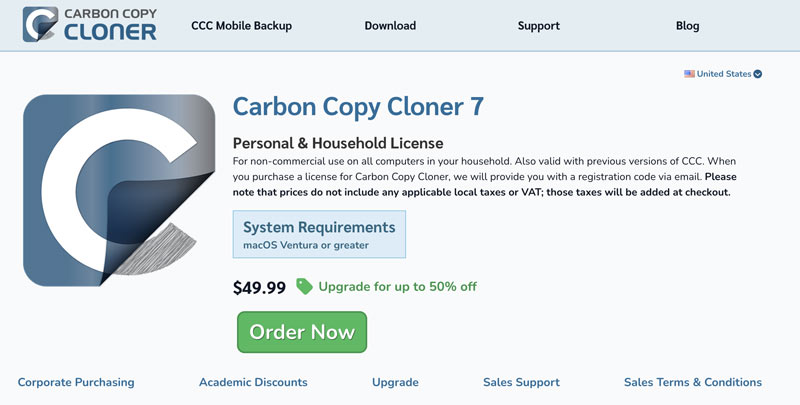 Carbon Copy Cloner offers a free trial so you can test its features before purchasing. If you are satisfied with the backup solution, you can upgrade to a paid version based on your needs. When you enter its official website, click the Buy Now button to get real-time pricing information. Generally, its single license starts at $49.99 for one Mac.