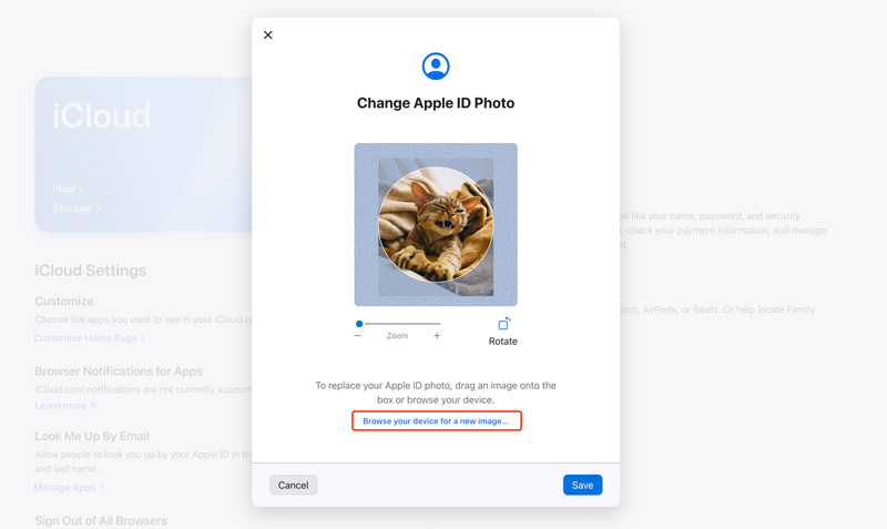 In the pop-up window, you can freely rotate or zoom in and out of the current profile photo. To replace your Apple ID photo, you can click Browse your device for a new image.