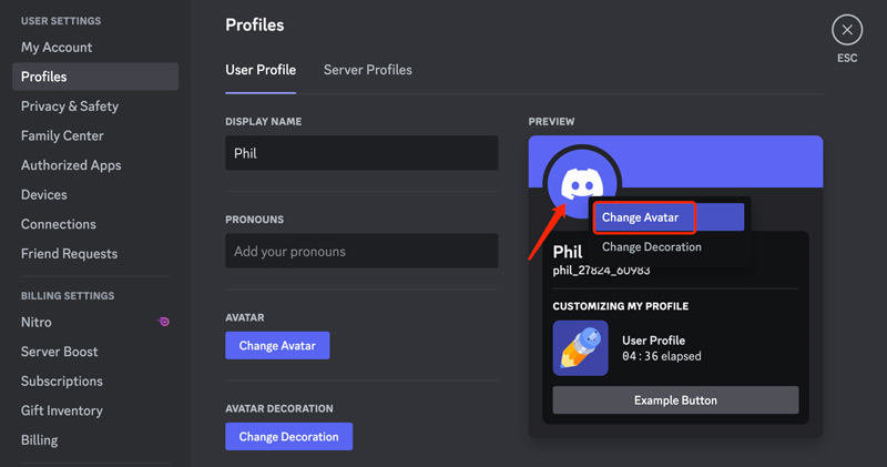 Under the User Profile tab, click your current Discord avatar and choose the Change Avatar option.