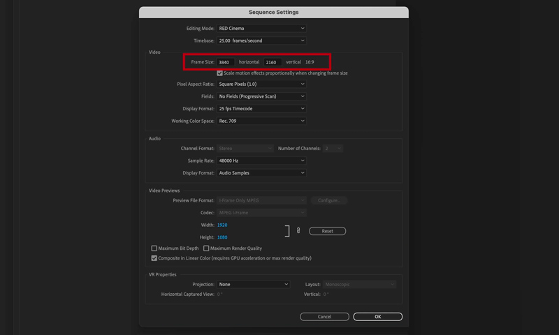 Under the Video tab in the Sequence Settings window, locate the Frame Size section. Choose the desired video resolution from the drop-down menu or enter custom values in the corresponding fields. During this step, you are allowed to adjust the frame rate and aspect ratio as needed. Then, click OK to save the changes.