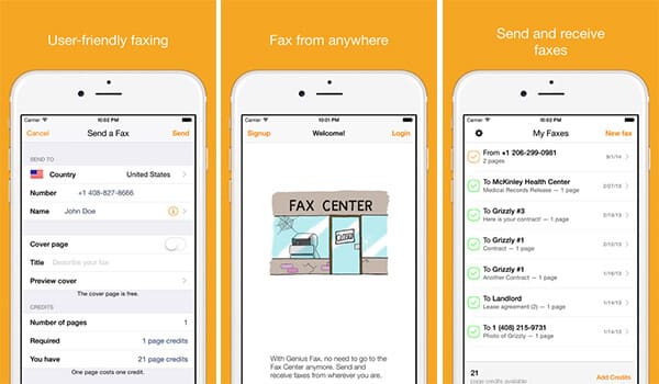 Genius Fax is fully compatible with Genius Scan. You scan documents with Genius Scan and fax them with the program. It is one of the competent free fax apps because it can send and receive faxes and has a simple and beautiful UI. The workflow is that you choose a file from any location, such as Dropbox, Google Drive, any other apps, and receive documents as PDF and can preview them or export them to any other apps. You have to spend money to fax. However, you can also spend money to temporarily rent a fax number to receive faxes from others.