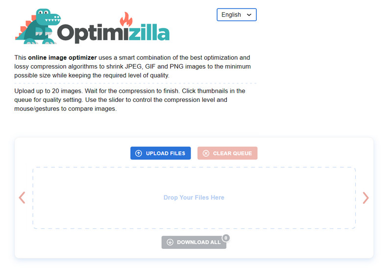 Image Compressor is a free image optimizer you can access on the web. This software allows you to do a lossy optimization to your JPEG, PNG, and GIF. With it, you can upload 20 images here and start optimizing them in one go. You cat tweak the compression settings here if you scroll down. But it is safe to say that it automatically compresses the file you upload here, and you can see the compression rate. Even though the tool can optimize, if you are about to visit it, you will see pop-up ads that could annoy and make the experience less attractive. So, if you need an optimizer on the go, this might likely be the tool you might encounter and use.