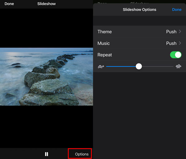 Tap the iPhone screen while the slideshow is running. Then choose "Options" on the lower right corner. You can get a popping-up window with the name of "Slideshow Options".