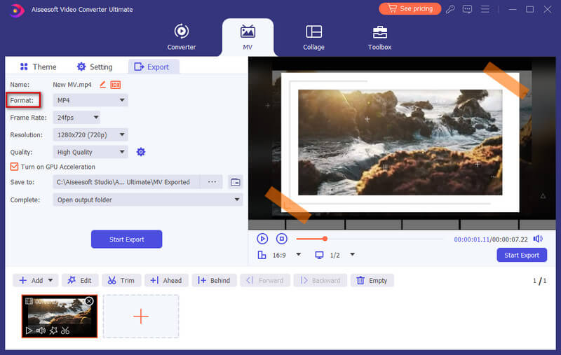 Once you are ready to export your MV, you can go to the Export tab to give a name for your project, and set the path to store it. You can also enable the Turn on GPU Acceleration option to speed up the exporting process. In the end, click on the Start Export button to produce your MV.