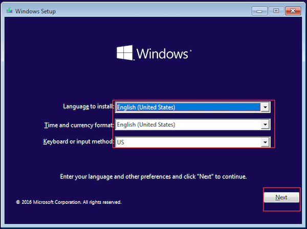 Insert the Windows bootable drive and boot from it. Then select your language preferences and click "Next".